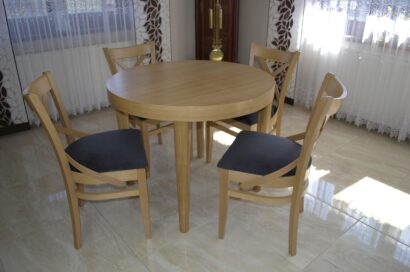 Oferujemy meble do klasycznych wnętrz oraz nowoczesnych salonów, w wielu rozmiarach. Bardzo praktycznym rozwiązaniem jest stół rozkładany z krzesłami, który po złożeniu zajmuje mniej miejsca i może być użytkowany na co dzień nawet w mniejszym mieszkaniu. W tej kwestii absolutnym fenomenem jest stół rozkładany Lexus, który standardowo może mieć średnicę 90 cm, a po rozłożeniu osiągać nawet ponad 3 metry.