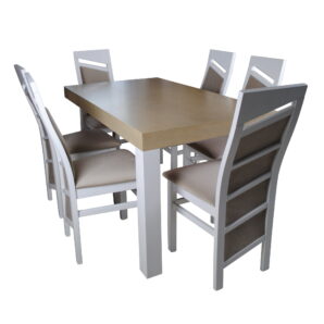 Możesz samodzielnie określić rozmiar, kolor i sposób wykończenia stołu i krzeseł. Oferujemy modne i popularne rodzaje wybarwienia drewna, takie jak biały, czarny czy orzech. Posiadamy zestawy mebli do salonu z matowym wykończeniem lub z połyskiem. Możesz wybrać grubość blatu stołu, kształt nóżek, rodzaj siedziska oraz gatunek tkaniny obiciowej krzeseł.