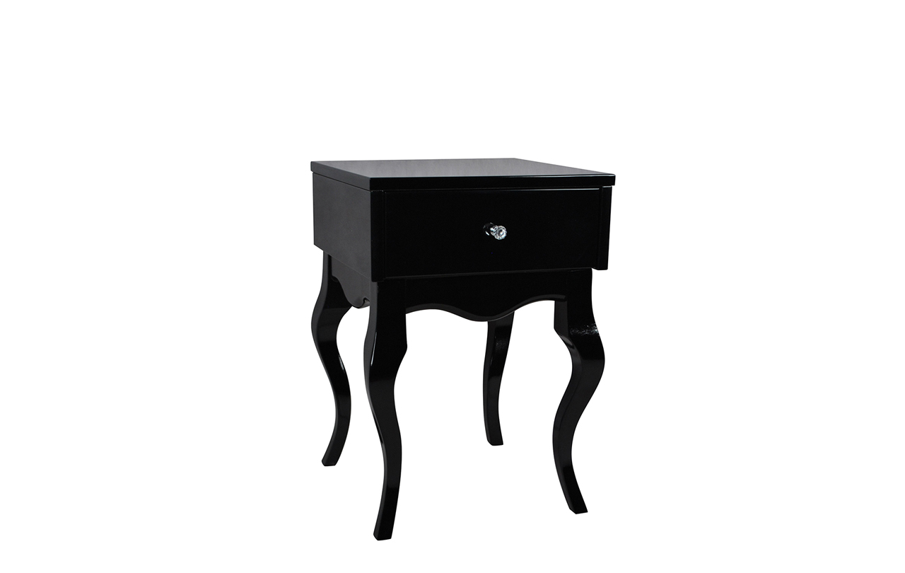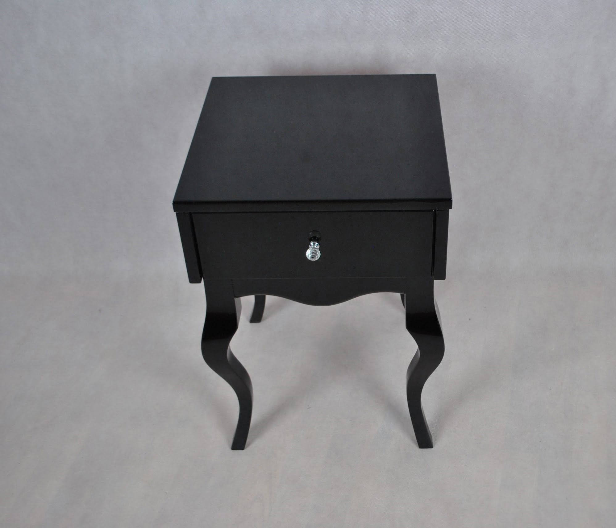 Stolik nocny na stylowych, drewnianych nogach polakierowanych na kolor czarny. Wyposażony w jedną szufladkę. W ofercie przedstawiony w czarnej kolorystyce lecz wybarwienie można dowolnie zmieniać wedle własnego uznania.