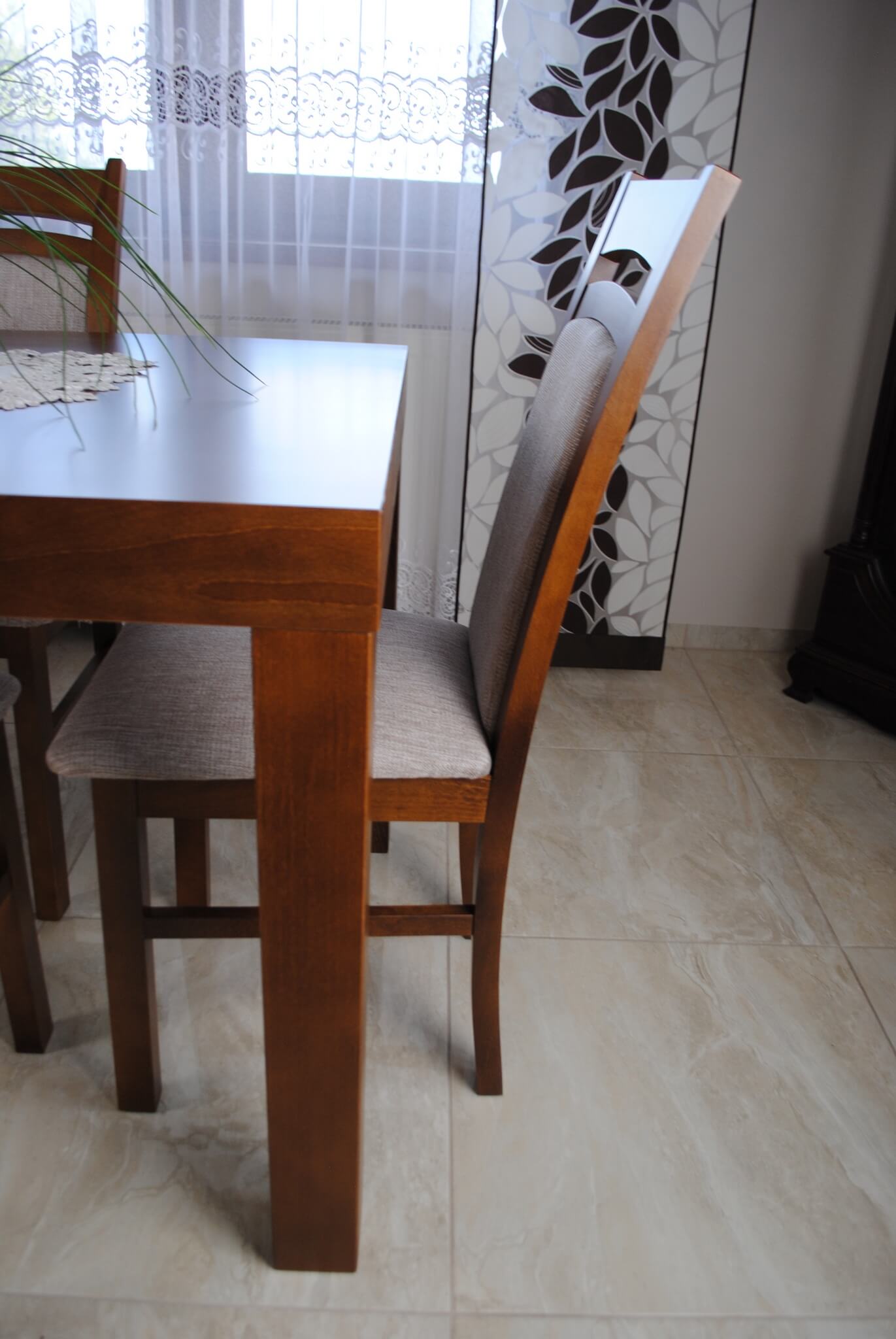 W skład kompletu zaliczają się również krzesła, które zostały wykonane z myślą o wielbicielach komfortu oraz stylowego, eleganckiego wyglądu. Świetnie zaprezentuje się w jadalni lub salonie, które są jednymi z ważniejszych pomieszczeń w naszych domach. Krzesła muszą być trwałe a przede wszystkim wygodne. Nasza propozycja spełnia oba te zagadnienia. Krzesło zostało wykonane z litego drewna bukowego, cechuje je trwałość a polakierowane wysokiej jakości lakierem dwuskładnikowym sprawia, że jego utrzymanie w czystości jest bardzo proste. Ergonomicznie wyprofilowane oparcie pozwoli wygodnie oprzeć plecy, natomiast tapicerowane siedzisko zapewni nam wysoki komfort użytkowania.