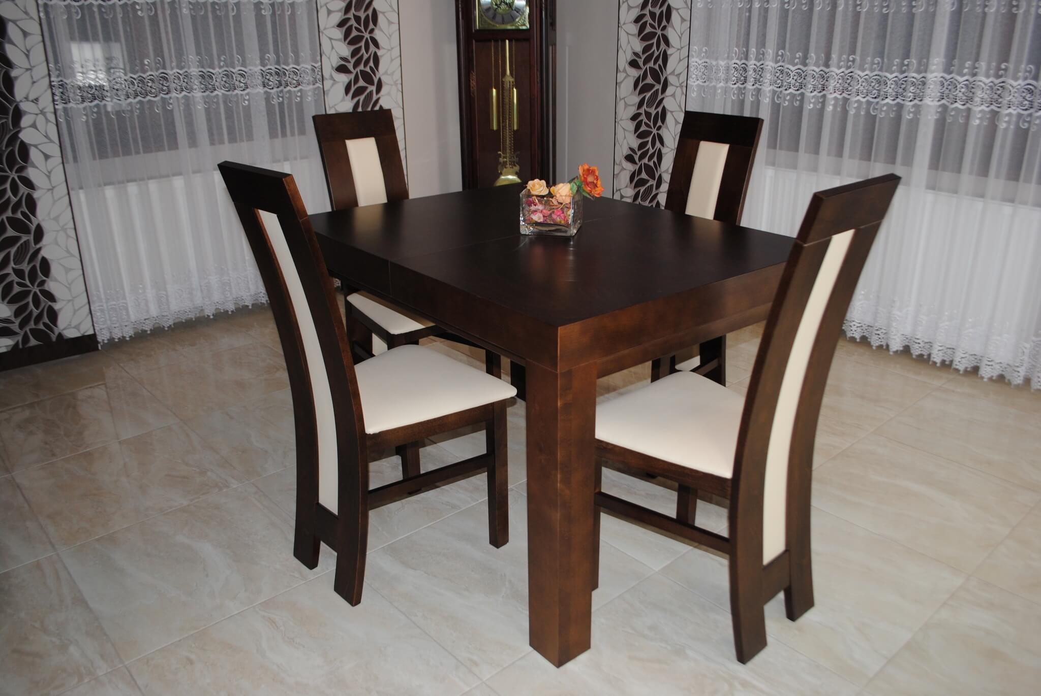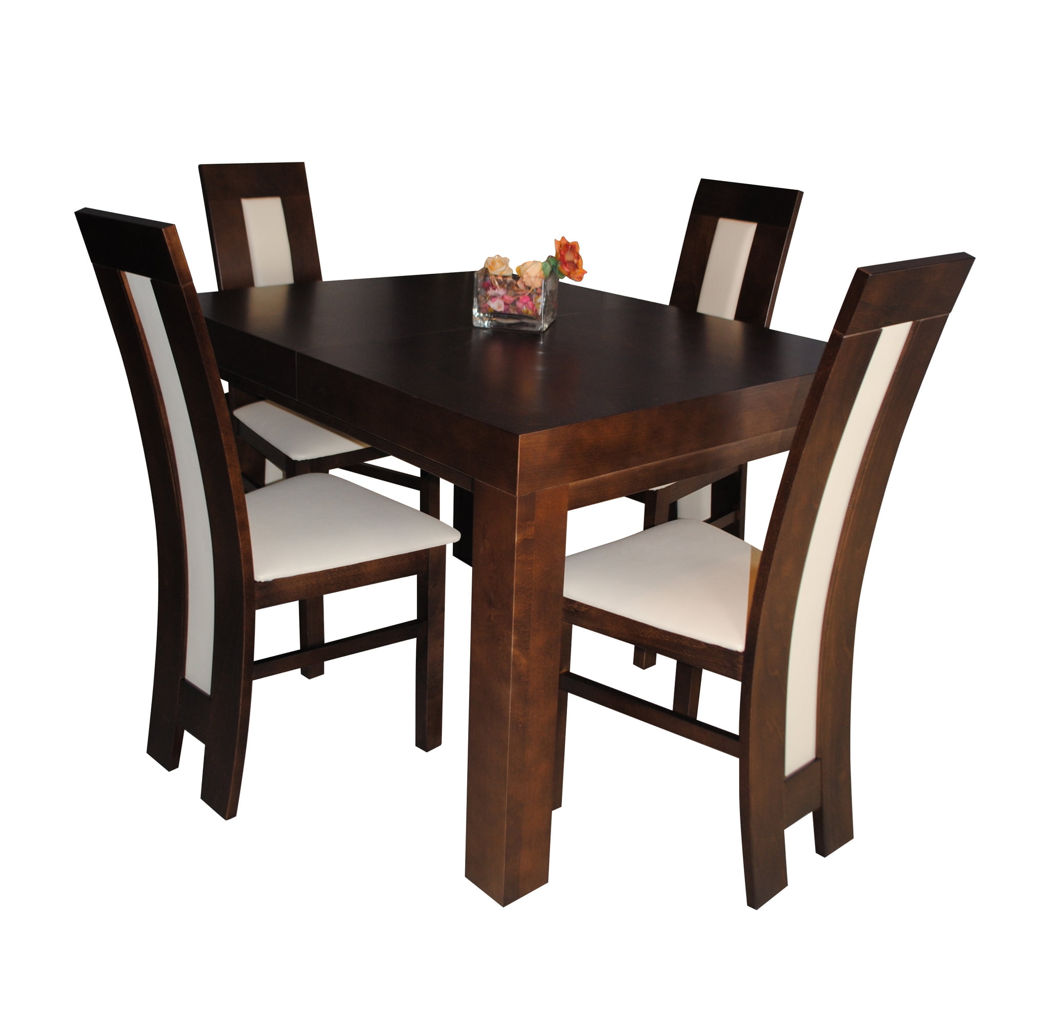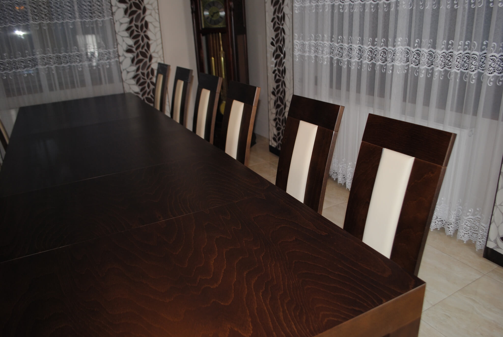 W skład kompletu zaliczają się również krzesła, które zostały wykonane z myślą o wielbicielach komfortu oraz stylowego, eleganckiego wyglądu. Świetnie zaprezentuje się w jadalni lub salonie, które są jednymi z ważniejszych pomieszczeń w naszych domach. Krzesła muszą być trwałe a przede wszystkim wygodne. Nasza propozycja spełnia oba te zagadnienia. Krzesło zostało wykonane z litego drewna bukowego, cechuje je trwałość a polakierowane wysokiej jakości lakierem dwuskładnikowym sprawia, że jego utrzymanie w czystości jest bardzo proste. Ergonomicznie wyprofilowane oparcie pozwoli wygodnie oprzeć plecy, natomiast tapicerowane siedzisko zapewni nam wysoki komfort użytkowania.