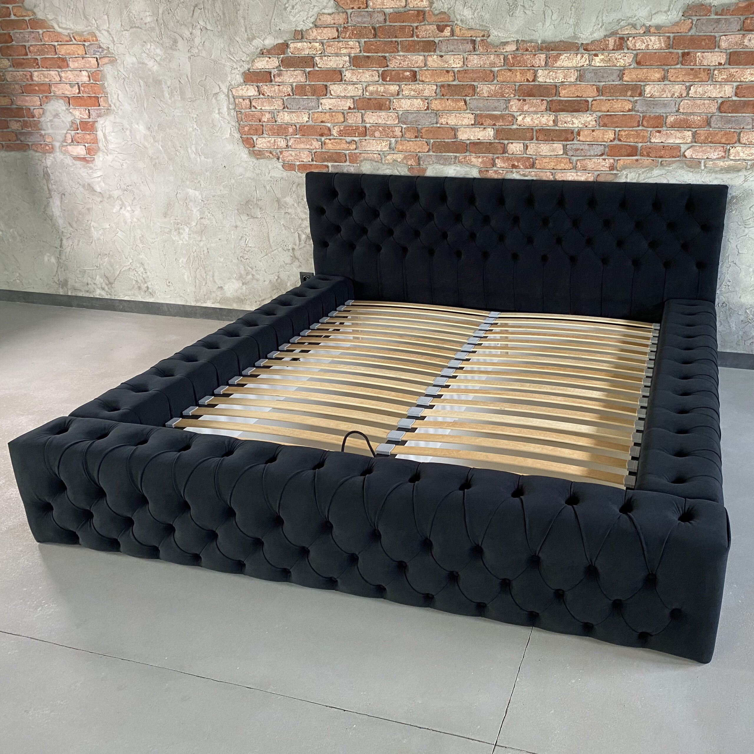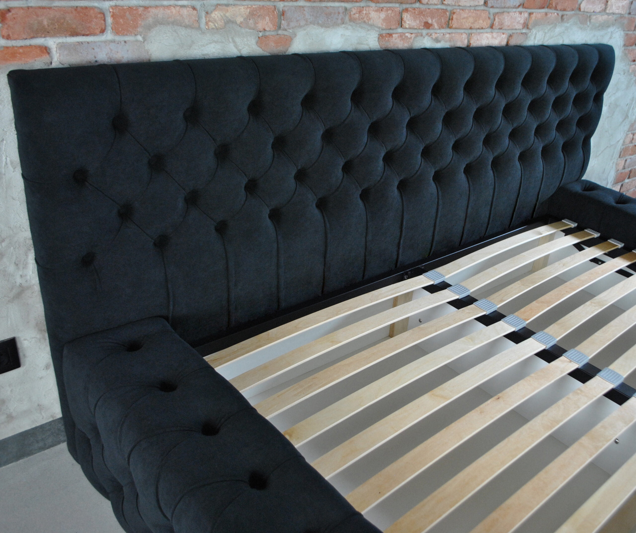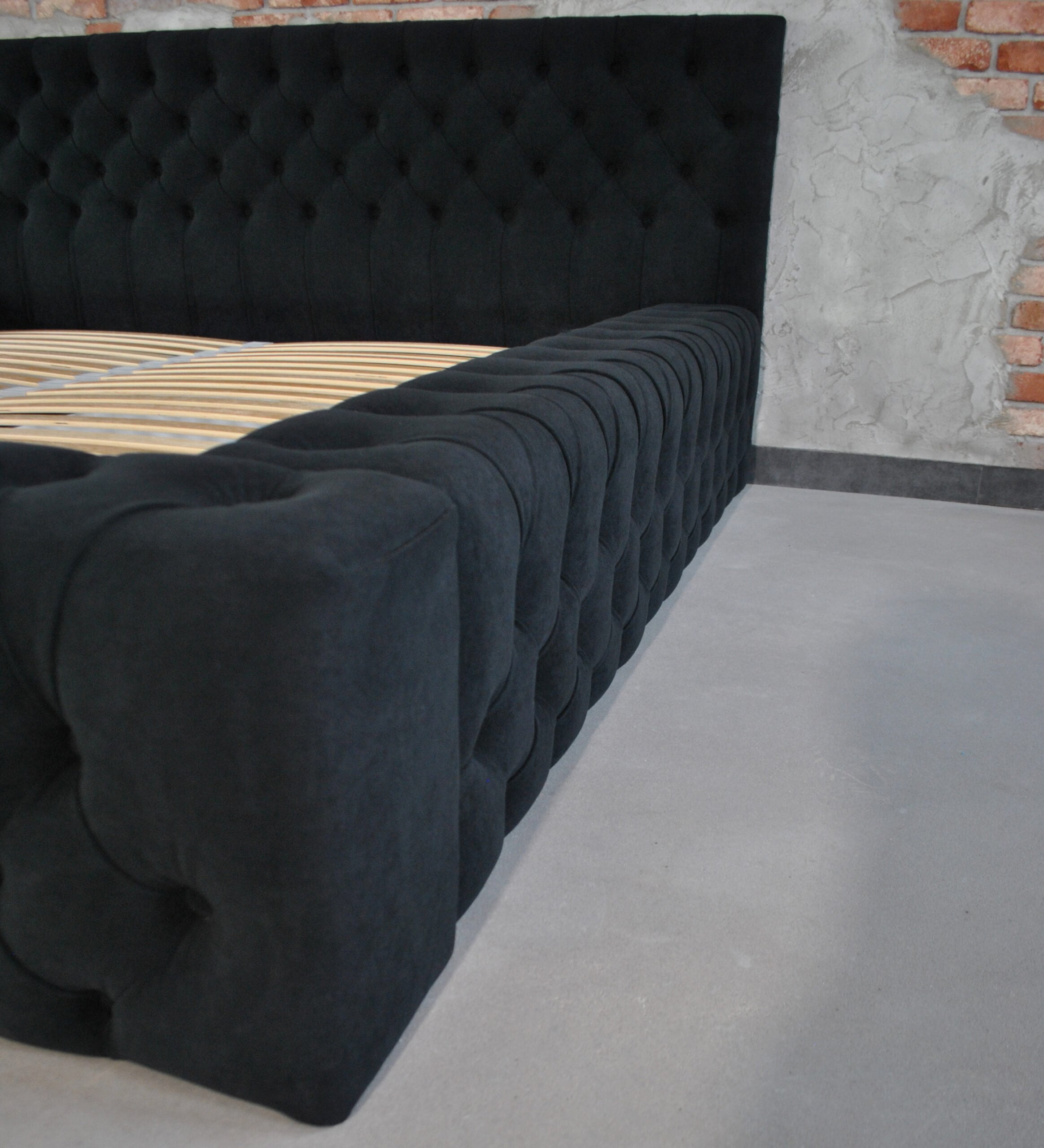 Wszystkie boki oraz zagłówek są głęboko pikowane w stylu chesterfield, co dodaje łóżku elegancji i uroku. Pikowania te sprawiają również, że łóżko jest wyjątkowo wygodne i miękkie w dotyku.
