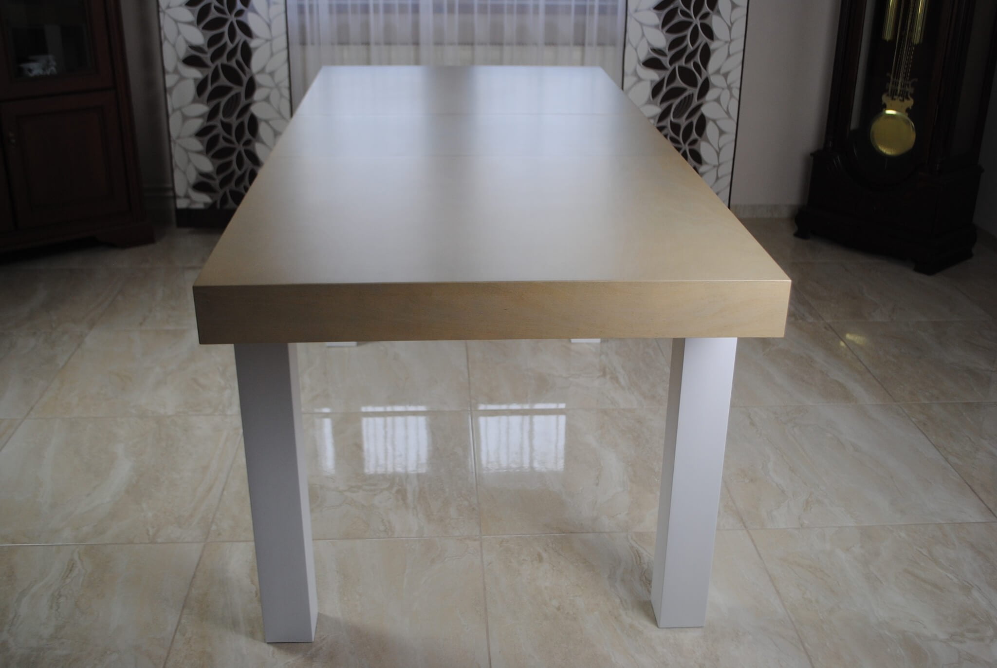 Stół rozkładany w zależności od potrzeb o 1 lub 2 wkładki, każda po 40cm. Nogi wykonane z litego drewna bukowego, blat okleinowany naturalnym fornirem bukowym, zalakierowany lakierem poliuretanowym dwuskładnikowym odpornym na ciepło i alkohol.